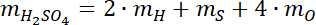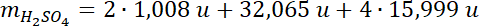 Cząsteczka kwasu siarkowego (VI) zawiera dwa atomy wodoru, jeden atom siarki i cztery atomy tlenu. Zatem, aby obliczyć masę cząsteczki, należy pomnożyć razy dwa masę atomu wodoru, dodać masę atomu siarki i pomnożoną przez 4 masę atomu tlenu.