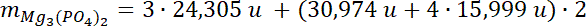 Cząsteczka fosforanu magnezu zawiera trzy atomy magnezu, dwa atomy fosforu i osiem tlenu. Aby obliczyć jej masę, zsumuj masy wszystkich atomów.