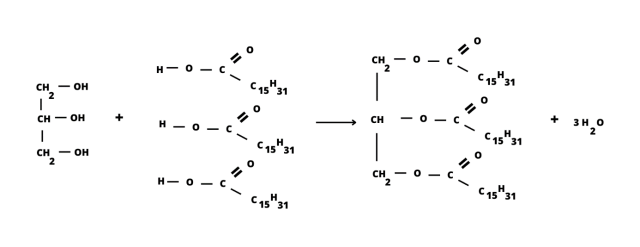 Wzór półstrukturalny tłuszczu o nazwie tripalmitynian glicerolu. Tłuszcz ten składa się z kwasu palmitynowego o wzorze C15H31COOH oraz z glicerolu o wzorze: