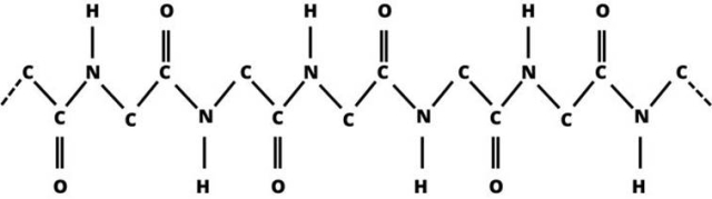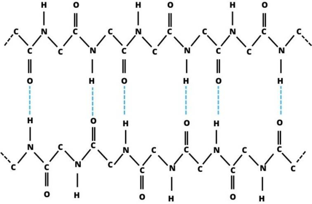 W tym zadaniu przerysuj rysunek do zeszytu i dorysuj drugi łańcuch peptydu tworzący z pierwszym strukturę harmonijki beta w taki sposób, że oba łańcuchy będą miały orientację antyrównoległą. Następnie zaznacz linią przerywaną wiązania wodorowe.