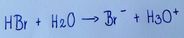 Zapisz równanie reakcji dysocjacji jonowej mocnego kwasu bromowodorowego. W zapisie uwzględnij tworzenie się jonu oksoniowego.