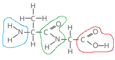 Zaznacz odpowiednimi kolorami grupy funkcyjne oraz wiązanie peptydowe w powstałym z dwóch aminokwasów związku.