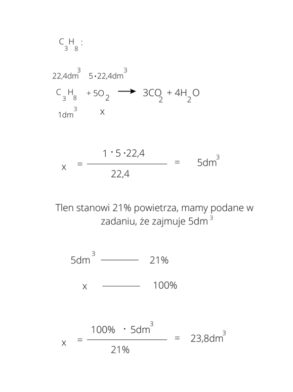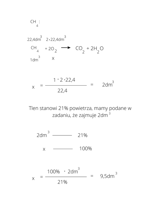 Zapisz równania reakcji, następnie zapisz dane. Wiemy, że 1 mol substancji w warunkach normalnych zajmuje objętość 22,4 dm3. W przykładzie z metanem, mamy 1 mol metanu, więc zajmuje on objętość 22,4 dm3 i 2 mole tlenu, dlatego nad tlenem zapisujemy 2 ∙ 22,4 dm3. W przykładzie z propanem mamy jeden mol propanu, czyli zajmuje on objętość 22,4 dm3 oraz 5 moli tlenu, dlatego nad tlenem zapisujemy 5 ∙ 22,4 dm3. Pod reakcją zapisujemy dane z zadania, czyli pod metanem i propanem zapisujemy objętość 1 dm3. Pod tlenem zapisujemy x. Liczymy z proporcji, jaka jest objętość tlenu potrzebna do spalenia 1 dm3 metanu i 1 dm3 propanu. Wiemy, że tlen zajmuje 21% powietrza, więc z proporcji liczymy ile powietrza potrzeba do spalenia metanu i propanu.