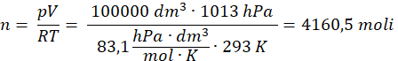 Obliczamy ilość moli powietrza w podanej próbce podstawiając dane do przekształconego równania Clapeyrona: