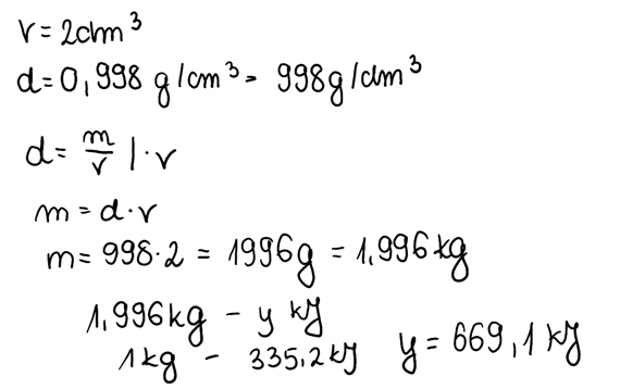 1. Z przekształconego wzoru na gęstość obliczamy masę wody, którą będziemy ogrzewać.