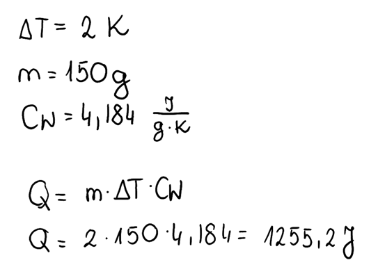 Oblicz ilość ciepła, jaką kulka musi przekazać wodzie, aby podgrzać podaną objętość wody o dwa stopnie.