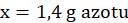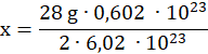 Używając masy molowej azotu obliczamy masę próbki azotu zawierającej 0,602 ∙ 1023 atomów (mnożymy ilość cząsteczek w 1 molu razy 2 – cząsteczki azotu są dwuatomowe):