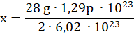 Używając masy molowej azotu obliczamy masę próbki azotu zawierającej 1,29p ∙ 1023 atomów (mnożymy ilość cząsteczek w 1 molu razy 2 – cząsteczki azotu są dwuatomowe):