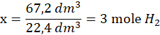 Oblicz ilość moli wodoru w 67,2 dm3.