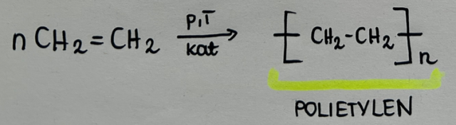 Reakcja polimeryzacji polega na łączeniu się ze sobą wielu cząsteczek związku nienasyconego wskutek rozerwania wiązania typu p lub jednego z wiązań p w wiązaniu wielokrotnym. Produktem takiej reakcji jest wielkocząsteczkowy związek chemiczny.