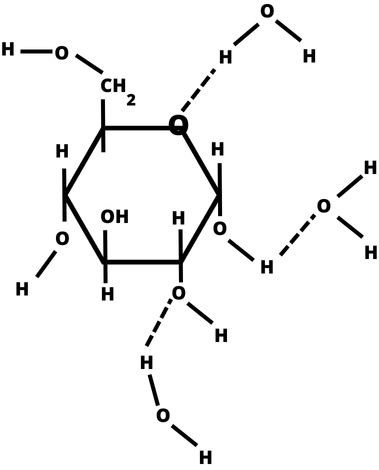 W tym zadaniu wykorzystaj wzór taflowy i narysuj w zeszycie schematycznie wiązania wodorowe, które mogą tworzyć się między cząsteczką α-D-glukopiranozy a cząsteczkami wody.