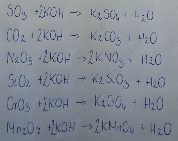 Poniżej przedstawiono reakcje wymienionych tlenków z dowolnie wybraną zasadą, w wyniku których powstają sole oraz woda jako produkt uboczny: