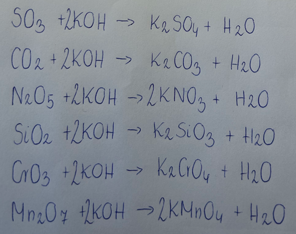 Poniżej przedstawiono reakcje wymienionych tlenków z dowolnie wybraną zasadą, w wyniku których powstają sole oraz woda jako produkt uboczny: