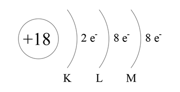 Argon ma liczbę atomową równą 18 – jest to liczba protonów w jądrze (wpisz ją w okręgu symbolizującym jądro atomowe). Znajduje się w trzecim okresie, ma zatem trzy powłoki elektronowe (podpisane literami K, L i M). Argon jest pierwiastkiem grupy osiemnastej, ma zatem osiem elektronów walencyjnych (w grupach 13 -18 liczba elektronów walencyjnych wynosi