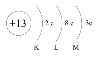 Glin ma liczbę atomową równą 13 – jest to liczba protonów w jądrze (wpisz ją w okręgu symbolizującym jądro atomowe). Znajduje się w trzecim okresie, ma zatem trzy powłoki elektronowe (podpisane literami K, L i M). Glin jest pierwiastkiem grupy trzynastej, ma zatem trzy elektrony walencyjne (w grupach 13 -18 liczba elektronów walencyjnych wynosi