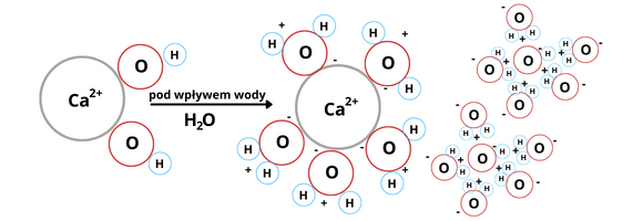W wyniku dysocjacji wodorotlenku wapnia w wodzie uwalniany jest jeden kation wapnia Ca2+ oraz 2 aniony wodorotlenkowe OH-. Są one solwatowane (otaczane) przez cząsteczki wody – cząsteczki wody otaczają kationy ujemnym atomem tlenu, natomiast aniony – dodatnio naładowanymi atomami wodoru cząsteczek wody.