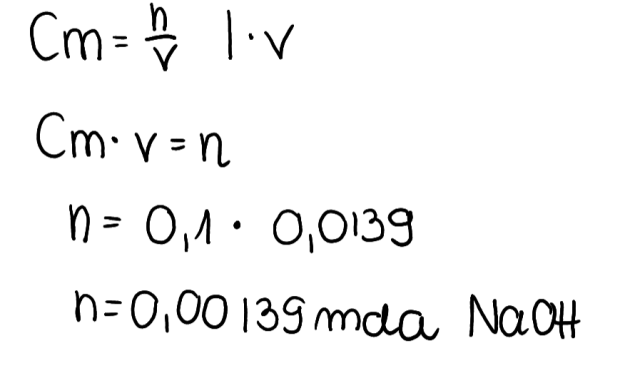 2. Odpowiednio przekształcając wzór na stężenie molowe należy obliczyć liczbę moli zasady, jaka wzięła udział w reakcji. Należy pamiętać, aby objętość miała odpowiednią jednostkę (dm3), zgodnie z przelicznikiem 1 dm3 = 1000 cm3: