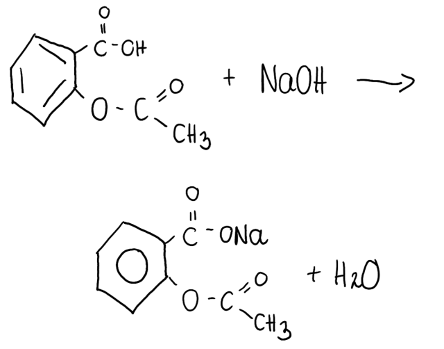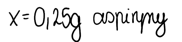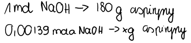 3. Z równania reakcji wiemy, że 1 mol aspiryny ważący 180g reaguje z 1 molem NaOH. Są to informacje niezbędne do sporządzenia odpowiedniej proporcji: