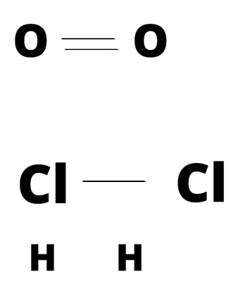 Na podstawie wzory strukturalnych zapisz w zeszycie wzory sumaryczne: O2, H2O, Cl2.