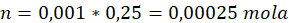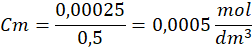 2. Następnie, korzystając z przekształconego wzoru na stężenie molowe, obliczamy liczbę moli soli w badanym jej roztworze. W obliczeniach wykorzystamy dane z treści zadania. Dla objętości dokonamy zmiany jednostki z cm3 na dm3 (1dm3=1000cm3), aby dostosować ją do jednostki stężenia molowego: