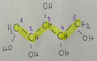 1. Wyodrębniamy najdłuższy możliwy węglowy łańcuch główny, zawierający w strukturze atomy węgla połączone bezpośrednio z grupą funkcyjną -OH.
