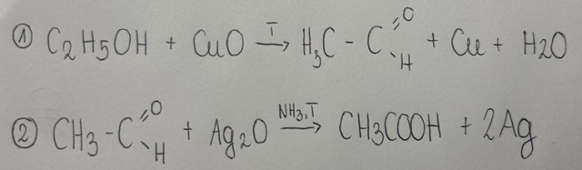 · Utlenianie alkoholi I-rzędowych prowadzi do powstania aldehydów o identycznej liczbie atomów węgla. Udział w tej reakcji robi tlenek miedzi (II). Miedź redukuje się wówczas z +II (w CuO po stronie substratów) na 0 stopień utlenienia (miedź w stanie wolnym po stronie produktów).