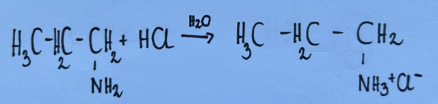 Napisz równanie reakcji zachodzącej między propylo-1-aminą a wodą z kwasem solnym. Podaj nazwy produktów tych reakcji.