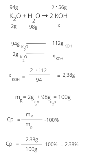 Nad równaniem zapisujemy sobie dane, które odczytamy z układu okresowego. Odczytujemy masę molową tlenku potasu, która wynosi 94 g/mol i zapisujemy ją nad tlenkiem. Pod zapisujemy 2 g, które są podane w treści zadania. W zadaniu mamy również podaną masę wody, dlatego w równaniu reakcji pod wodą zapisujemy 98 g. W zadaniu mamy obliczyć stężenie procentowe wodorotlenku potasu, do wzoru na stężenie procentowe potrzebna nam jest masa substancji (czyli masa KOH) oraz masa całego roztworu. Nad wodorotlenkiem potasu zapisujemy jego masę molową, zwróć uwagę, że po dobraniu współczynników musimy je również uwzględnić w obliczeniach, dlatego masę wodorotlenku potasu mnożymy razy 2. Pod wodorotlenkiem zapisujemy x, a następnie z proporcji liczymy masę KOH. Masa roztworu jest to masa tlenku potasu oraz wody (wynosi 100 g). Następnie podstawiamy dane do wzoru na stężenie procentowe i wykonujemy obliczenia.