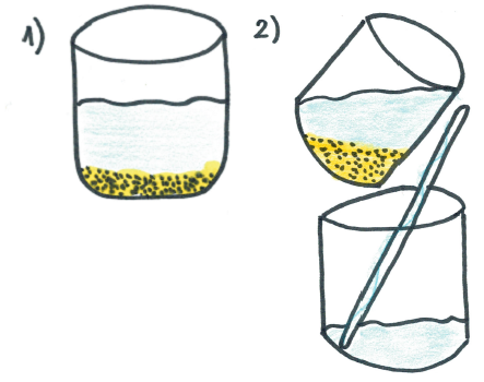 Połącz ze sobą dwie substancje: wodę i piasek. W celu rozdzielenia tej mieszaniny użyj metody sedymentacji i dekantacji. Pozwól aby piasek opadł na dno naczynia, następnie zlej wodę do innego naczynia.