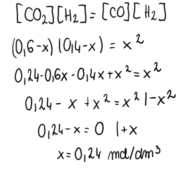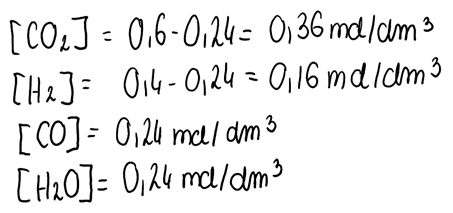 4. Znając wartość niewiadomej X, obliczamy stężenia równowagowe substratów i produktów reakcji: