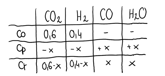 1. Sporządzamy tabelkę, zgodnie z którą będziemy mogli wyznaczyć stężenia równowagowe reagentów. W zadaniu nie jest znane dokładne stężenie równowagowe produktów, zatem niezbędne jest wprowadzenie niewiadomej X.