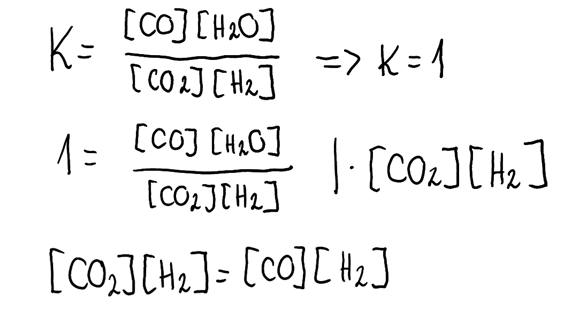 2. Zapisujemy wrażenie na stałą równowagi opisanej reakcji, wiedząc, że jest to iloczyn stężeń produktów podzielony przez iloczyn stężeń substratów. Wiedząc, że wartość stałej wynosi 1, upraszczamy przygotowane wyrażenie: