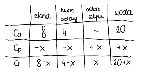 2. Sporządzamy tabelkę, która pozwoli na wyznaczenie stężeń równowagowych. Niezbędne jest wprowadzenie niewiadomej X: