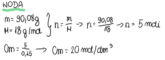 1. W pierwszej kolejności obliczamy liczbę moli reagentów opisanych w treści zadania, dzieląc ich masę przez masę molową, a w następnym kroku, znając objętość i korzystając z wzoru na stężenie molowe, obliczamy Cm dla tychże reagentów: