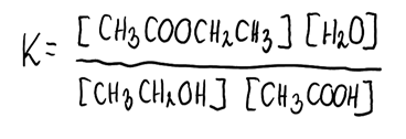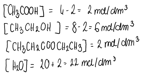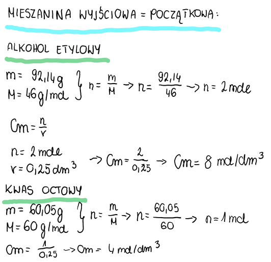 4. Obliczamy stężenia równowagowe reagentów biorących udział w reakcji estryfikacji: