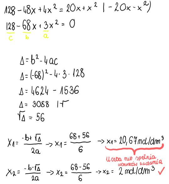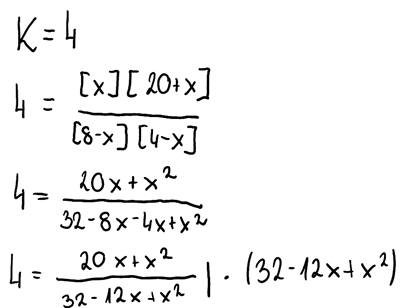 3. Znając wyrażenie na stałą równowagi, stężenia równowagowe i wartość stałej równowagi, podstawiamy odpowiednie wielkości:
