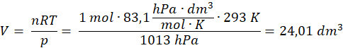 Następnie na podstawie podanych danych obliczamy objętość 1 mola gazu w opisanych warunkach: