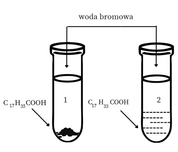 Kwas w probówce 1. to kwas stearynowy (nasycony wyższy kwas karboksylowy), natomiast kwas w probówce 2. to kwas oleinowy (nienasycony wyższy kwas karboksylowy).