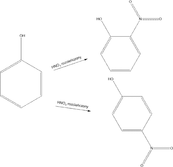 Jest to reakcja nitrowania, podczas której powstaną dwa produkty, izomery o różnych położeniach grup NO2 → jeden w pozycji orto, drugi w pozycji para.