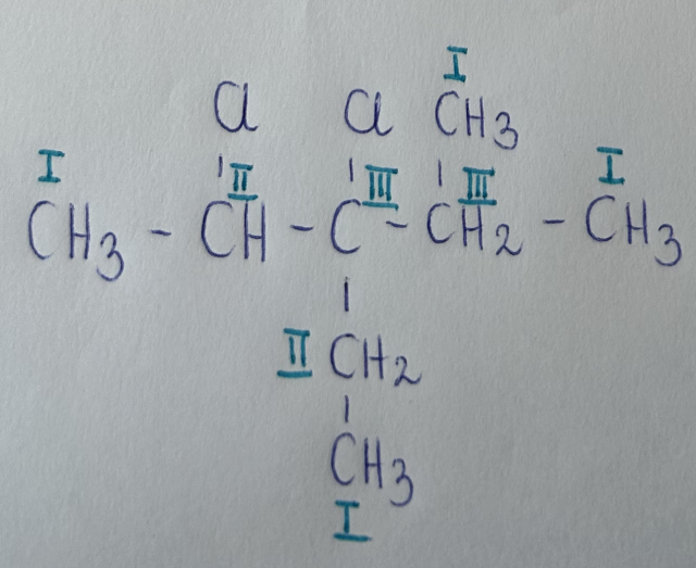 Ustal, jaka jest rzędowość poszczególnych atomów węgla w przedstawionym związku.