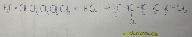 Zgodnie z regułą Markownikowa, w reakcji addycji cząsteczek niesymetrycznych (np. HCl, H2O), do niesymetrycznej cząsteczki alkenu atom wodoru przyłącza się do tego atomu węgla przy wiązaniu wielokrotnym, który jest połączony z większą liczbą atomów wodoru.