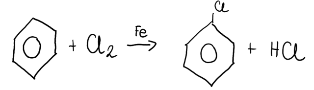 Benzen przyłącza fluorowce, takie jak brom i chlor w reakcji zwanej substytucją elektrofilową. Dochodzi tu do ataku cząstki elektrofilowej na pierścień aromatyczny, a do zajścia reakcji niezbędny jest katalizator w postaci chlorku żelaza (III) bądź opiłków żelaza. Mechanizm ten jest wieloetapowy.