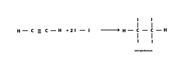 W tym zadaniu napisz równanie reakcji etynu z jodem, jeśli produktem reakcji jest związek nasycony. Podaj jego nazwę.