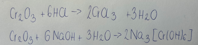 Zapisz w formie cząsteczkowej równania reakcji udawadniajace amfoteryczny charakter tlenku chromu (III), mając na uwadze, że produktem jednej z reakcji jest heksahydroksochromian (III) sodu.