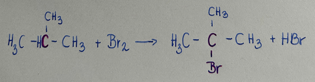 W porównaniu do pozostałych atomów węgla, które łączą się z trzema wodorami (atomy węgla I-rzędowe), wyznaczony łączy się jedynie z jednym atomem wodoru (jest węglem III-rzędowym), zatem przyłączy się do niego atom fluorowca.