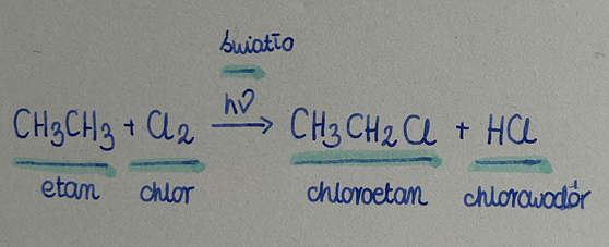 Jedną z nielicznych reakcji chemicznych, w jakich biorą udział alkany jest reakcja substytucji wolnorodnikowej, w trakcie której jeden atom wodoru w cząsteczce zostaje podstawiony atomem odpowiedniego fluorowca, z którym wchodzi w intereakcję. Inicjatorem (nie katalizatorem!) tej reakcji jest światło.