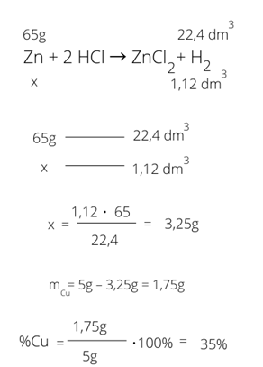 Nad równaniem zapisujemy sobie dane, które odczytamy z układu okresowego. Odczytujemy masę molową cynku, która wynosi 65 g/mol i zapisujemy ją nad cynkiem. Pod cynkiem zapisujemy x, ponieważ w zadaniu mamy obliczyć zawartość % miedzi. Skoro stop o masie 5 g składa się z miedzi oraz cynku, to obliczając masę cynku i odejmując ją od 5 g, otrzymamy masę miedzi. W zadaniu mamy podane, że wydzieliło się 1,12 dm3. Wiemy, że jeden mol zajmuje w warunkach normalnych 22,4 dm3, dlatego nad wodorem zapisujemy 22,4 dm3, a pod wodorem dane z zadania, czyli 1,12 dm3. Liczymy x z proporcji.