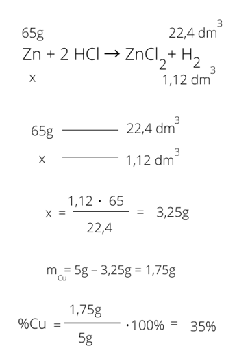 Nad równaniem zapisujemy sobie dane, które odczytamy z układu okresowego. Odczytujemy masę molową cynku, która wynosi 65 g/mol i zapisujemy ją nad cynkiem. Pod cynkiem zapisujemy x, ponieważ w zadaniu mamy obliczyć zawartość % miedzi. Skoro stop o masie 5 g składa się z miedzi oraz cynku, to obliczając masę cynku i odejmując ją od 5 g, otrzymamy masę miedzi. W zadaniu mamy podane, że wydzieliło się 1,12 dm3. Wiemy, że jeden mol zajmuje w warunkach normalnych 22,4 dm3, dlatego nad wodorem zapisujemy 22,4 dm3, a pod wodorem dane z zadania, czyli 1,12 dm3. Liczymy x z proporcji.