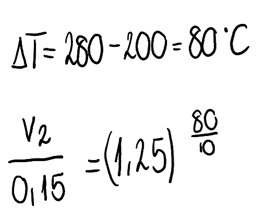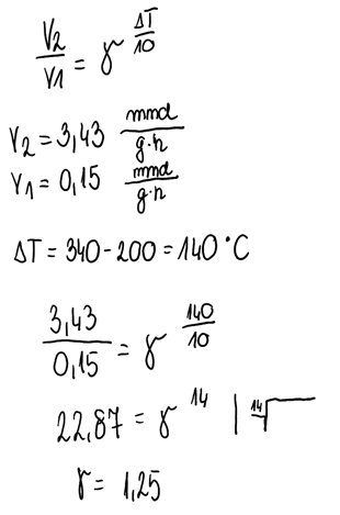 3. Znając wartość współczynnika temperaturowego oraz różnicę temperatur z drugiej części zadania, obliczamy, podstawiając do wzoru, teoretyczną wartość prędkości reakcji w temperaturze 280oC: