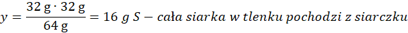 Z równania wynika, że cała siarka w SO2 pochodzi z siarczku. Ilość siarki w otrzymanym tlenku jest równan ilości siarki w użytej próbce związku: